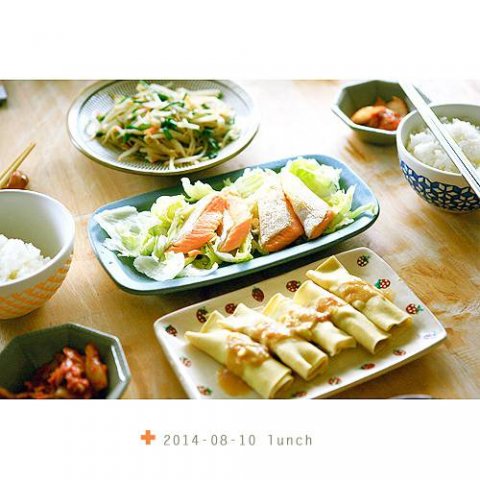 简单午餐豆芽炒韭菜煎鲑鱼豆腐皮肉卷
