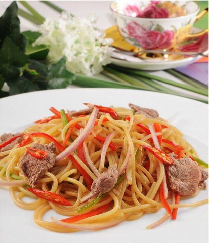 美味的牛肉炒意大利面图片
